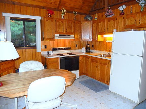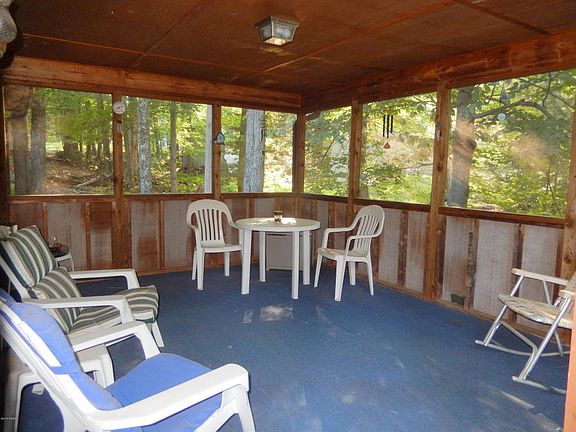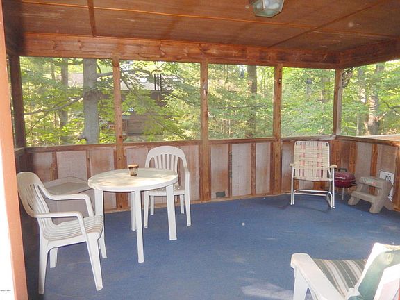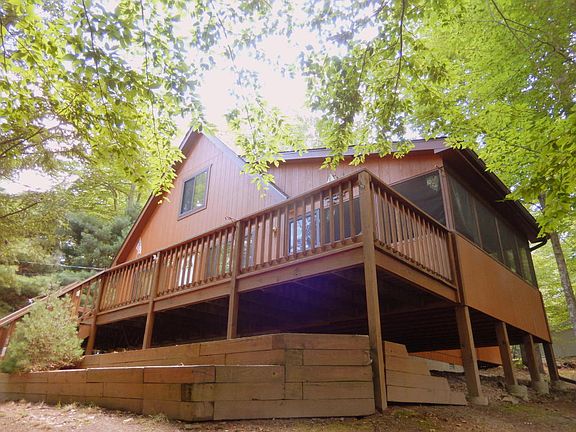 WLE CUTE AND CLEAN 4 Season CHALET flanked by privacy pines with a fresh coat of paint and new roof. All the work is done. Time to Relax. Features open floor plan with T&G beamed and cathedral ceiling, Over sized Loft and balcony viewing, 16x12 Screened Porch and sun deck Dining. Paved driveway, storage shed. Designed for Pleasures ready and waiting for your offer.