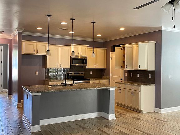 - Features: Breakfast Bar, Kitchen Island, Pantry, Stainless Steel Appliances, Solid Surface Counters