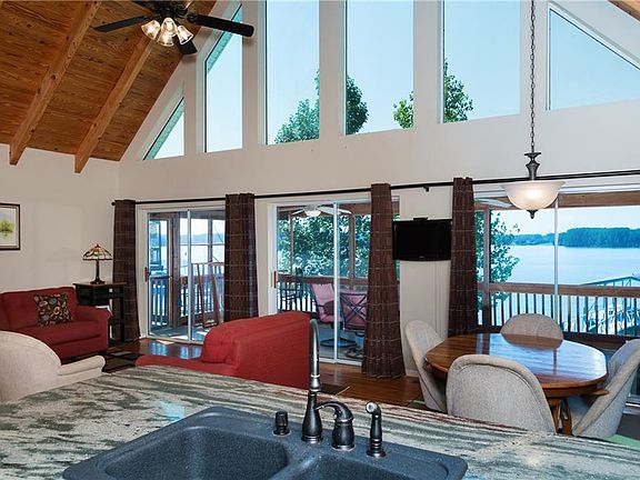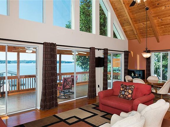 Views, views, views! Fall in love with the view from this affordable move-in ready retreat. This home features a spacious, open floor plan with huge waterfront views from it's entire lakeside. Close to everything, highlights include a gentle sloping lot and walkway to the shoreline with a private, open water, covered dock. A home you'll remember for those great lakeside BBQ's. This is the place for waterfront entertaining with expansive waterfront for year-round enjoyment. Cathedral windows allow this bungalow to feel much larger than it's size. There are multiple patio doors leading to the waterfront merely a few feet from the house. This retreat offers a full width covered porch and patio below, large enough to be used for your choice of additional living space, dining space or the family's every day relaxing space. The main floor features pine wood floors, two stories of windows with a beam accented cathedral ceiling and, the highlight of successful family gatherings, an open combination of a living room, dining room and spacious kitchen. The main level also offers the owners suite with large bath and tile shower. Kitchen features include cottage styled cabinetry and a breakfast bartop. The loft offers a private bedroom with personal bath and the terrace level features a large recreation space with generously sized third bedroom and third full bath directly off the lakefront. Additional storage can be found in the garage for rafts, skis or lake toys. There are several spots that lend options for future patio, firepit or entertaining. ** Note Investors: Weekend and weekly rentals are permitted in this area. ** Conveniently located directly across the main lake channel from the Lake Keowee Marina and merely minutes from restaurants, medical and shopping. Comfortable enough to make a special home away from home. Value unique enough to make your very own.