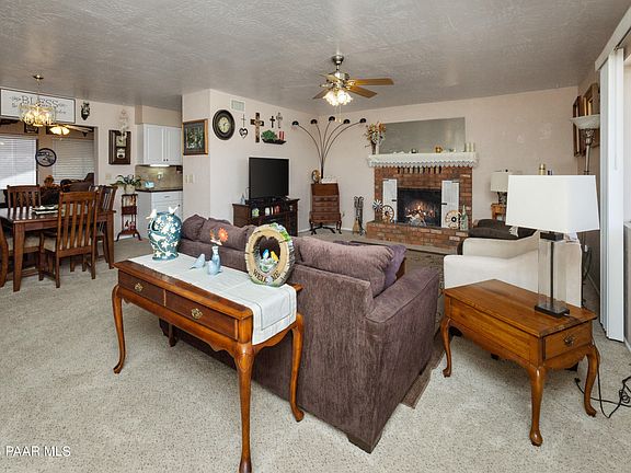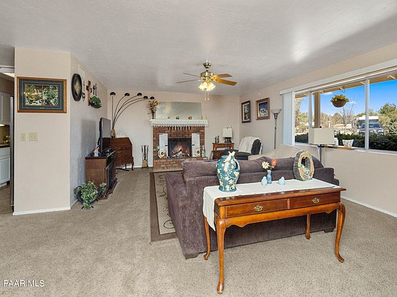 Immaculately maintained with great curb appeal, this single-level Dewey-Humboldt home is located at the end of a sleepy cul-de-sac on one of the larger lots of the highly desirable and amenity rich PrescottCountry Club. Entering the home via the security screen front door, you are greeted by a beautiful tiled foyer with a coat closet. This opens out to the living room and its brick surrounded wood burning fireplace. The kitchen, which also features an adjacent dining area, offers a nice tile backsplash that extends to the base of the updated cabinetry. There's a double vessel sink and water filtration system and the Whirlpool stainless steel appliance package includes a refrigerator/freezer combo and four plateelectric stove with above microwave. There's also a dishwasher.