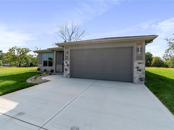 Call agent for details on our monthly builder incentive! Experience easy living at Golf Hill Estates in this beautiful new construction home, complete with an upgraded exterior and maintenance-free lifestyle. From the moment you step inside, rows of windows fill the home with natural light and frame open views straight through the main living space. Engineered hardwood floors flow throughout the expansive 16x22 living room, which connects seamlessly to the kitchen. Designed for both function and style, the kitchen features quartz countertops, custom cabinetry, and a walk-in pantry. The spacious primary suite offers a barn door entry to the private ensuite, featuring separate vanities, a tiled shower, and a generous walk-in closet. Each bedroom includes ceiling fans for year-round comfort. Conveniently located on the main floor, the laundry room provides additional storage and direct access to the oversized garage. Extend your living outdoors with a covered back patio—ideal for both entertaining and relaxing. With lawn care and snow removal included, you’ll have more time to enjoy the lifestyle Golf Hill Estates was designed for.