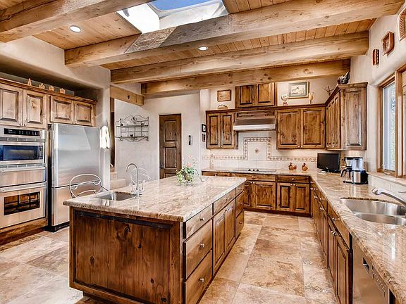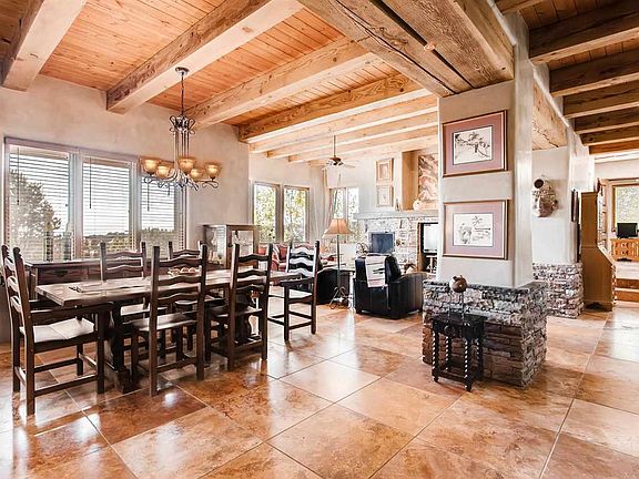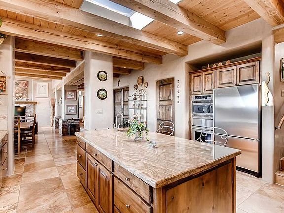 Seize this opportunity to own a one-of-a-kind home in the coveted Sierra Del Norte subdivision, complete with never-ending views of the Sandia & Jemez Mountains. The stunning sunsets from this perched home will take your breath away, and you can enjoy them year-round from one of several portals which are accented by wood beams and brick floors. Inside you will find a well-equipped chef's kitchen with Thermador appliances, high-quality Alder cabinets, granite counters, a large island, under-cabinet lighting and spacious pantry. The living area's open concept with tall, beamed ceilings and oversized stacked-stone fireplace is perfect for entertaining loved ones or relaxing at the end of the day. Upon retiring for the night, the split floor plan with separate guest area affords plenty of privacy in the master bedroom which is complimented by hand-troweled plaster walls & built-in shelving and it's own kiva to stay toasty on wintry evenings. A large master closet/bath with built-in cabinetry, walk-in shower and double vanity sinks will help you get ready for nights out on the town. Or you can stay in and watch the sunset, with a glass of wine, from the oversized Jacuzzi bath. Throughout the home you will find multiple skylights, plaster walls, custom wood blinds, and stunning travertine tile. This property has all the details you would expect in a fabulous Santa Fe home!