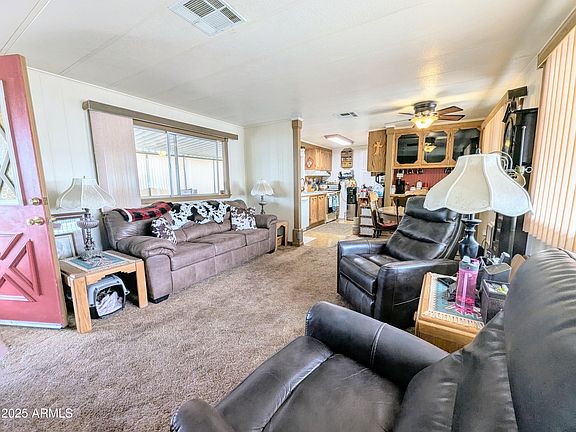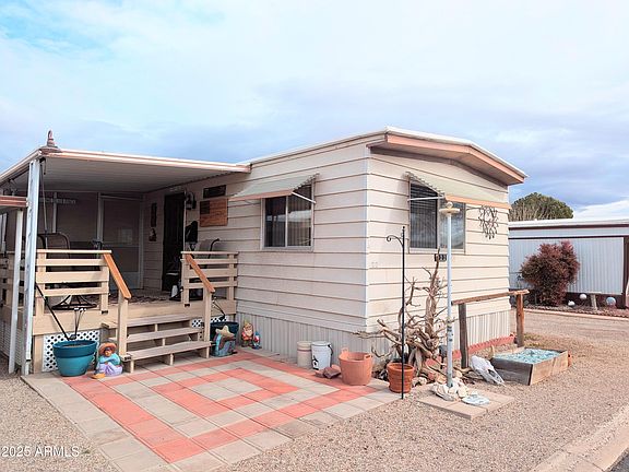 This beautifully maintained mobile home in San Pedro RV Resort is ready to move into. This 966 sq ft home offers a split floor plan, open living and dining space, bright kitchen with custom southwestern cabinetry and built in coffee bar. Stacked laundry is tucked away in a closet area on way to the primary bedroom. The addition of a screened Arizona room offers additional space for relaxing or entertaining. All screens and sunshades on the property are less than a year old. San Pedro RV Resort is a 55+ community packed with amentities. You will find both an indoor and outdoor pool, recreation room, pickleball court, dog park, walking trails, and more! All of this is waiting for you to call it home!