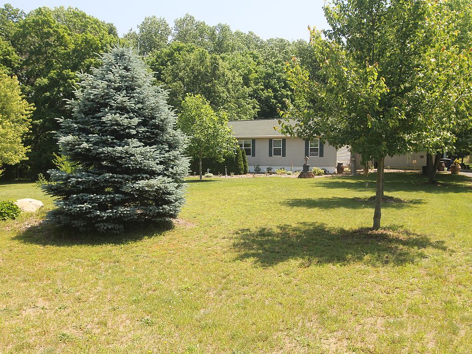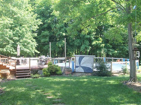 Ranch on 7 acres with various trees: oak, maple, sassafras, honey locust & more. Among the trees is a creek with salmon running through the property. Beautiful and peaceful. 3 bedrooms, 2 baths. Split bedrooms. Built in 2004. Master bedroom with walk-in closet, Jacuzzi & Shower. Large living rm (27x25). Eat-in kitchen with plenty of cabinet space. Hard surface counter top. Hunter Fans. 9 ft ceilings in unfinished basement. Heated 30 ft wide pool with automatic vacuum. 2 car attached garage. Greenhouse with electric & water ($11 per month). City water & well system. Sunroom for year round enjoyment. Great location! Next to two golf courses & Pottawattamie Park. South Shore train runs close by. Easy commute from Chicago to South Bend.