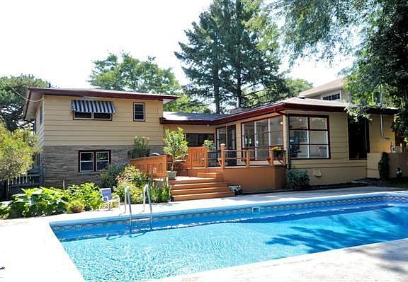 Great 4 Bedroom home across from school! Wood floors! Exciting open floor plan with tons of large windows! Vaulted living room with stone Fireplace and vaulted formal dining room! Sunken family room with lots of large windows, walk out to multi-level deck and private fenced yard with in-ground pool! Great eat-in kitchen with windows to pool and yard! Main floor has bedroom/office and full bath! 3 BRs on upper level, all with hardwood floors! Full bath on UL! Lower level rec room! 2 car attached garage! Home Warranty included.