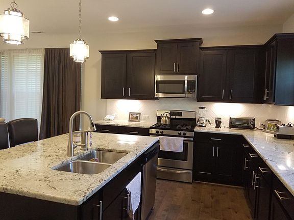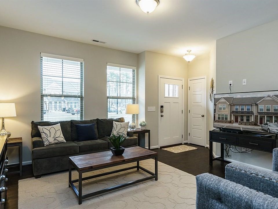 Bridgewater A floor plan. End unit with 3rd floor Private wooded homesite- 3 full bedrooms and 3.5 bathrooms! Kitchen features granite counter tops, tile back splash, stainless steel Kenmore gas range, dishwasher & microwave.Hardwood floors throughout first floor. Beautiful open floor plan featuring a Master Suite with tray ceiling, ceramic tile shower and dual vanities, plenty of closet space and spacious secondary bedrooms. Pet park in neighborhood, 3.5 miles of walking trails, great access to HWY40, HWY55, RTP, Duke University & Southpointe Mall.