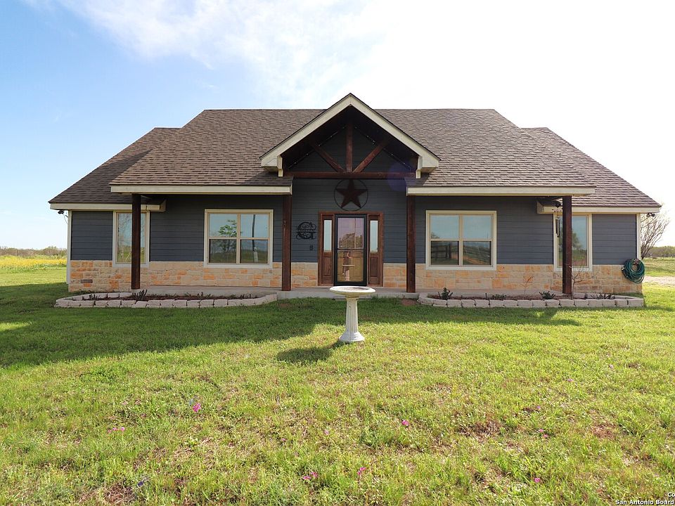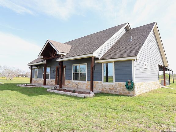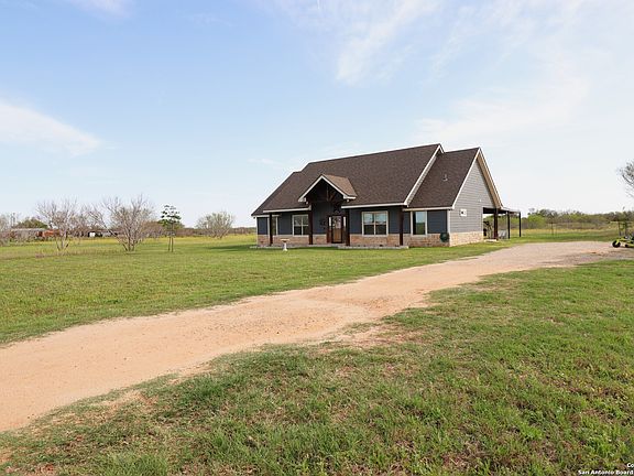 Are you looking to experience country living? Then look no further than this remarkable and unique single-story custom home nestled on 10 acres in Pleasanton, TX. This 3 bedroom 2 1/2 bath gem was built in 2019 and greets you with plenty of natural light, a spacious open floor plan and 10ft ceilings throughout the home. Beautiful, multi-color granite countertops in the kitchen match and tie-in with all other countertops in this home, giving a great aesthetic pleasure to the overall feel and look on the inside. The kitchen is also adorned with a stainless steel refrigerator, flat-top stove, custom cabinets, a walk-in pantry, and a deep sink. The dining room fits up to a 10-seat table that backs into the breakfast kitchen bar with stools that provides an extra spot for entertaining or that eat-on-the-go type of person that can definitely utilize this area to its full potential. The tray-style ceiling with custom lighting in the master suite gives a soothing feel to this room that must not be overlooked along with a luxurious bathroom with double vanity, stand up shower and huge walk-in closet. A utility room with washer and dryer, the guest bathroom with tub and bigger than standard 2nd and 3rd bedrooms with ceiling fans close out the inside of this home. Lastly but definitely not least, you can step out back to the bulk of the 10 acres and a huge covered patio with an outdoor 1/2 bath, custom lighting, outdoor furniture and a bar area that is already fitted and wired for sound. This home is a must-see for anyone looking to experience the country life and entertain family and friends for years to come.