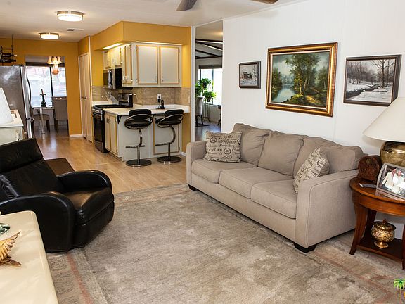 What a beautiful home at a great price. Large and spacious with an attached 2 car garage, raised rear patio with wheel chair elevator lift down to ground level. Beautiful laminate floors throughout, with upgraded Kitchen. Great location across the street from the clubhouse and pool. Better take a look at this one before it's gone. Desert Sands is a wonderful and exclusive gated senior community with clubhouse, fitness room, pool, spa, sauna, pool tables, card room, kitchen and meeting room. Onsite management meticulously maintains the grounds. Current space rent is 747.