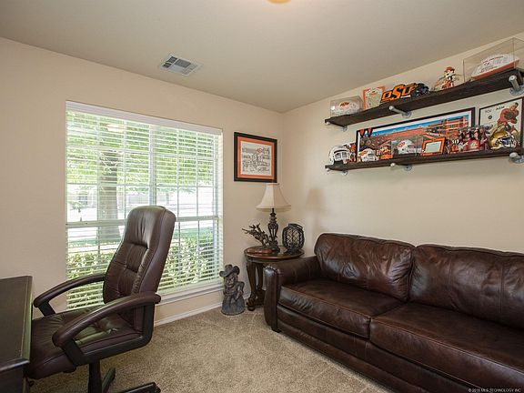 Immaculate, desirable Jenks Schools. Family room French doors overlook beautiful yard w/ extended patio. Backs to greenbelt. Neighborhood trails & park. Enhanced moldings, carpets, updated paint colors. 4th bdrm can be office. Large master, split plan.