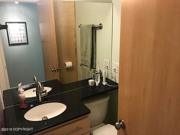 Totally Remodeled, this Knik Arms corner-unit shares walls with no other unit. Maple cabinets, granite counter tops, peek-a-boo view of inlet, perfect view of downtown and Chugach Mtns. Solid surface flooring. Stunning one-bedroom. Dues include hear, electricity, snow removal, water, and sewer.