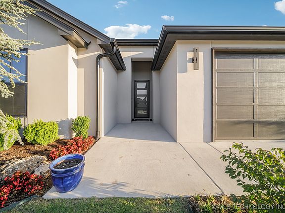 Hyde Park at Tulsa Hills...where luxury meets privacy. This gated 55+ community is designed to provide a first class community experience including access to the amazing clubhouse, pool, indoor/outdoor pickleball courts, library, tennis court, putting green, game room, gym, card room and outdoor kitchen. Lawn maintenance is included in the HOA. This single owner single level home has received numerous upgrades since purchase including expansive outdoor landscaping, an 8' privacy fence and additional cabinetry. The tankless and instant hot water feature is an appreciated bonus. A vaulted and beamed kitchen and dining area is open to a spacious living room with a gas fireplace for fall and winter evenings. The pocket office provides needed flex space and the split floor plan affords privacy for the primary enSuite as well as guest enSuites. Neutral colors create the perfect palette upon which to layer personal design. A covered patio is the perfect space for morning coffee or evening sunsets. This is a wonderful place to meet friends and enjoy and sense of unparalleled community.