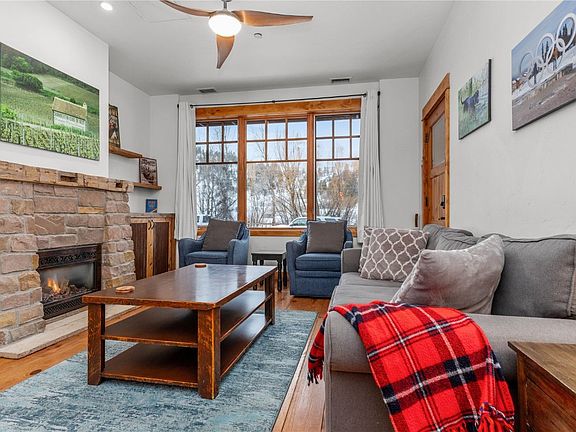 This is a very unique downtown ground level unit with an attached one car heated garage and two entrances. It is also Handicap/Adaptive Accessible which enhances rental possibilities. Out the front living room windows you have views of the Howelsen Hill ski runs aand the Yampa River. The Yampa River Core Trail for hiking and biking is just across the street from the front door and Little Toots Park and the library are just steps away. The open living/dining/kitchen space is very cozy with a stone gas fireplace, wood floors and custom built-in cabinets for storage and eating bar. Great kitchen to cook in and entertain. Primary bedroom has views out the front and the bath has a walk=in shower and jetted tub. This area of downtown is in the Green Zone for short term rentals. City bus is a block away.