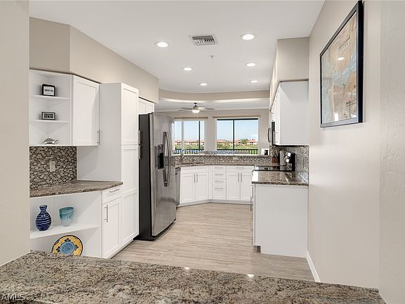Your opportunity to live in the best building in Bellavista with unobstructed panoramic views over looking the golf course and lake; next door to the community pool. This amazing property has everything updated, hurricane glass on all windows including master bedroom lanai door with a new picture window in the living room, freshly painted, plank tile throughout including the lanai, new carpet in the bedrooms, new cabinets, appliances, granite and tile backsplash in the kitchen. Den has 10 pane glass French doors, bathrooms feature tile shower surrounds, new cabinets, fixtures, counters and comfort height toilets. Master features large walk-in closet with pocket doors, oversized 2 car garage. 186 slip deep water Marina with slips available for lease or purchase. All amenities available with membership purchase. Sq. Ft. approximate or from Lee Co. Master Association Fee: $1,350/Annually, Condo Fee $867 monthly.