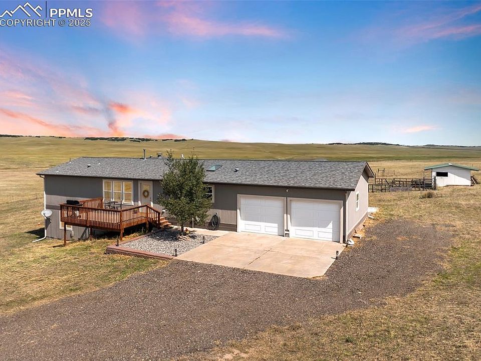 Welcome home to East Larkspur! A RARE, 35-acre lot zoned for A-1 agriculture with prairie-to-peak panoramic views! Conveniently located only 3.5 miles east of I-25 on Greenland Road where your only neighbors to the north are the cattle that graze the nearly 18,000 acres of forever-protected land known as Greenland Ranch. With Pikes Peak's majestic presence to the south, and Rattlesnake Butte to the west where the sunsets are a sight to behold, you'll feel like you've escaped the busy life "out there." Here, it's quiet, expansive, and breathtaking — and all yours to create the life you've always wanted. Live out your dream of becoming a rancher or hobby farmer, or simply enjoy the low-maintenance lifestyle this move-in ready, fully renovated, ranch-style home can offer! Inside you'll immediately notice all the sunlight this home allows in and how functionally and thoughtfully remodeled this home is. You'll feel like you've walked into a new home with new luxury vinyl plank floors, carpeting, gorgeous kitchen quartz countertops, appliances, washer and dryer, lighting, hardware, baseboards, interior and exterior paint, new furnace and hot water heater, and a new Class-4 impact-resistant roof! No surface was left untouched on the main level! You'll enjoy the vaulted ceilings, skylight, views from every window, and the easy flow here. The primary suite will win you over with its 5-piece bathroom, complete with freestanding soaking tub and huge walk-in closet! The full, walkout basement offers plenty of storage or a blank canvas to add more bedrooms and living space! The 2-stall barn with corral is ready for your can't-leave-behind domestic animals! Your home on 35 acres borders Greenland Road and Haskel Creek and is priced appropriately for you to add outbuildings to complete your lifestyle! Join the Larkspur, Castle Rock, and Monument events — all lively and welcoming towns with plentiful shopping and restaurants! Come live the good life in East Larkspur!