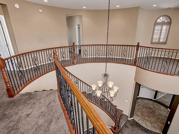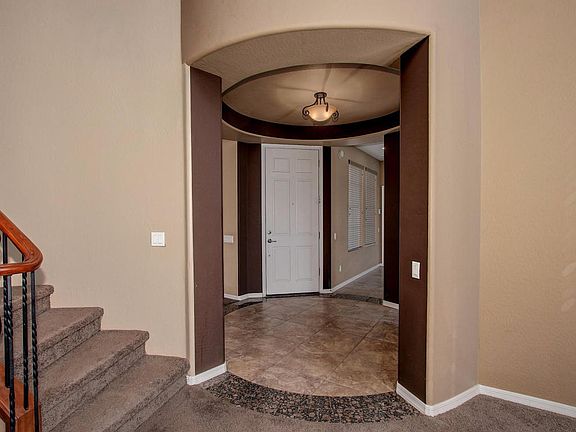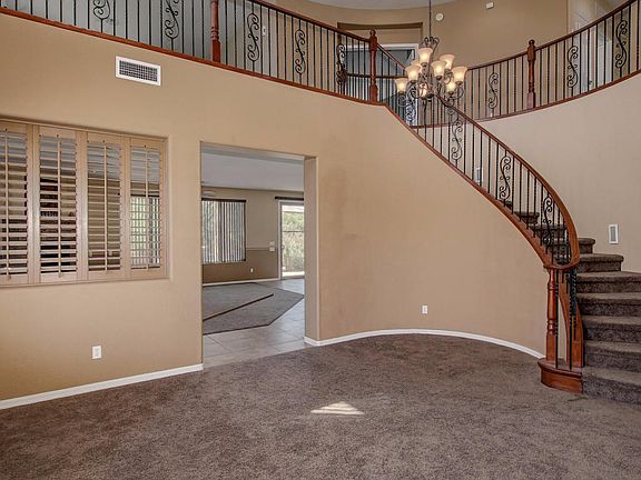 Beautiful Mountain Horizons home features expansive vaulted ceilings, Dramatic spiral staircase, pebble-tec pool with water features, and an entertainer's back yard. Private back yard backs to desert. Thoughtfully laid out, this expansive home provides separate entrances from each side of the home through the split garage design. One bedroom and attached bathroom downstairs with separate access to the exterior. Master suite, with two large walk in closets, is located upstairs. Wood shutters and blinds throughout. Open kitchen features granite counters, upgraded cabinets, stainless appliances, a huge pantry and tons of additional storage. RV gates