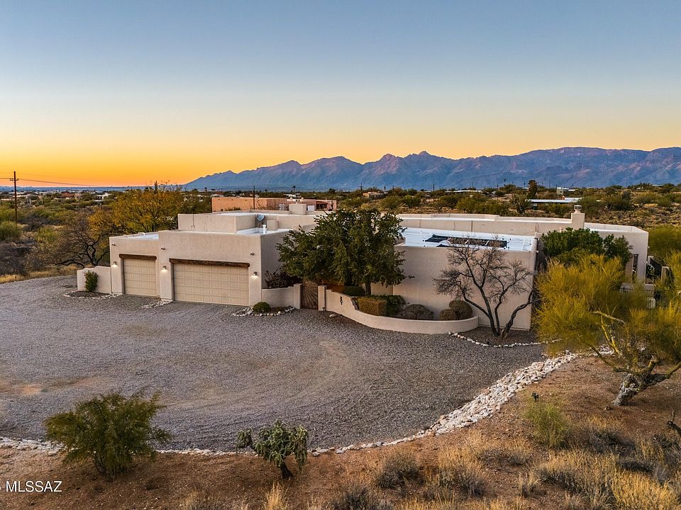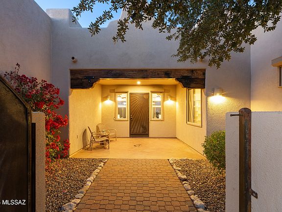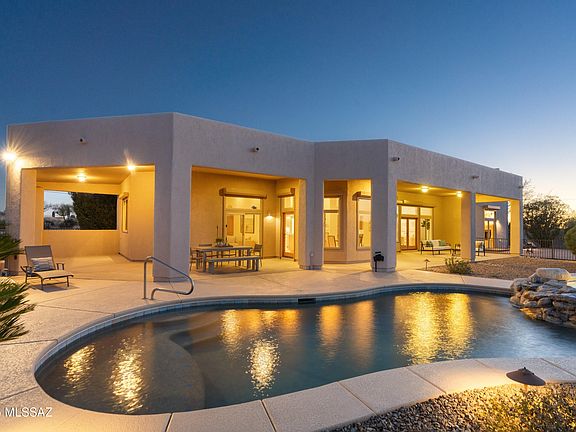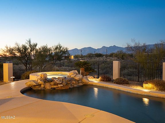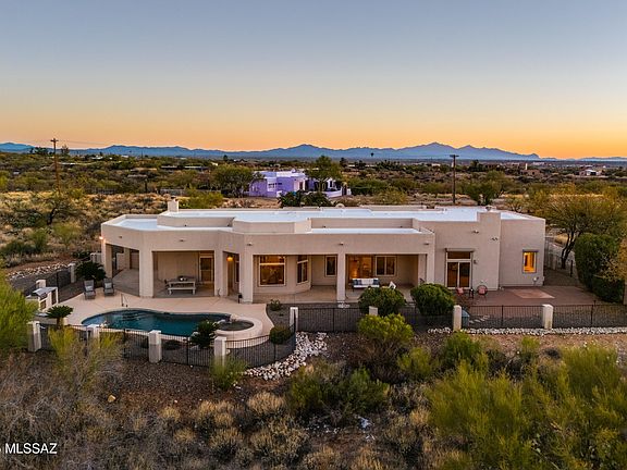 Stunning Santa Fe Retreat with spectacular Mountain Views Nestled in the heart of the pristine Sonoran Desert, this spectacular Santa Fe-style home is perfectly situated on a sprawling 4-acre parcel, offering unparalleled, panoramic views of the Catalina and Rincon Mountains. A grand courtyard entry welcomes you with a custom wrought iron gate and door, beautifully accented by wood corbels and lush, mature landscaping--setting the stage for the elegance that awaits inside. Step through the entryway and be greeted by soaring 12-foot ceilings, wood corbels, and French doors and windows that frame the breathtaking desert vistas. The expansive kitchen is a chef's delight, featuring rich Alderwood cabinetry, stainless steel appliances, and a five-burner gas cooktop set in a custom niche adorned with Talavera tile accents. Elegant granite countertops, a tile backsplash, and a breakfast bar overlook a cozy breakfast nook with picture-perfect windows, creating a warm and inviting space. Adjacent to the kitchen, a spacious family room boasts a corner beehive fireplace, a built-in entertainment center, and a picture window framing the stunning Rincon Mountains. The primary suite is a private sanctuary, offering a tranquil corner fireplace, sliding glass doors, and a clerestory window that floods the space with natural light. Step outside to enjoy private backyard access and take in the serenity of the surrounding landscape. The spa-like en suite features a double vanity with Talavera sinks, a corner soaking tub, a separate walk-in shower, and a generous walk-in closet. Designed with privacy in mind, this architecturally pleasing split-bedroom layout offers generously sized bedrooms, most with walk-in closets, and a convenient Jack-and-Jill bathroom. The expansive wraparound patio is an entertainer's dream, offering unobstructed Catalina and Rincon Mountain views. A sparkling pool, an elevated spa with a soothing water feature, and a built-in BBQ area create an idyllic setting for relaxation. Whether you're admiring the twinkling night skies or the brilliant blue daytime skies, this space is designed for year-round enjoyment. Modern rolling shutters on all windows and doors (except front door) provide added security and peace of mind while traveling, easily controlled with the touch of a button. The spacious laundry room offers granite countertops, built-in cabinetry, and a laundry sink for added convenience. A three-car garage with a dedicated storage room ensures plenty of parking and organization. This home checks every box, offering privacy, breathtaking views, and expansive living spaces in an unmatched desert setting. Don't miss this extraordinary opportunity!