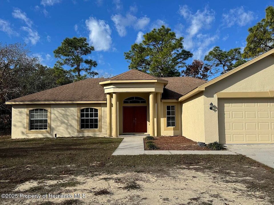Come see this spacious 4-bedroom 2 bath home on over a half-acre and covered lanai. Enter the home with the double doors and cathedral ceilings, into the large great room. It is a split floor plan. All the bedrooms are a great size. The 2nd bath features double sinks and a tub shower combo. The Primary suite is very large with sliding glass doors to the covered lanai. The Primary Bathroom has double sinks, a large garden tub for soaking, and a walk-in shower. There are two walk in closets. There is a separate dining area with a set of sliding doors. The kitchen is spacious with lots of cabinets and countertops. There are two pantries and room to dine in. There is a side entry to the garage. This home is situated just north of Hexam, which is a paved road. It should meet financing requirements, but cosmetic updates are needed. It is priced accordingly. Please call today to schedule your showing. THE OWNER HAS JUST HIRED A ROOFING COMPANY TO REPLACE THE ROOF. IT SHOULD BE COMPLETE BY THE END OF FEBRUARY. ACT FAST AND YOU CAN PICK THE COLOR!!!