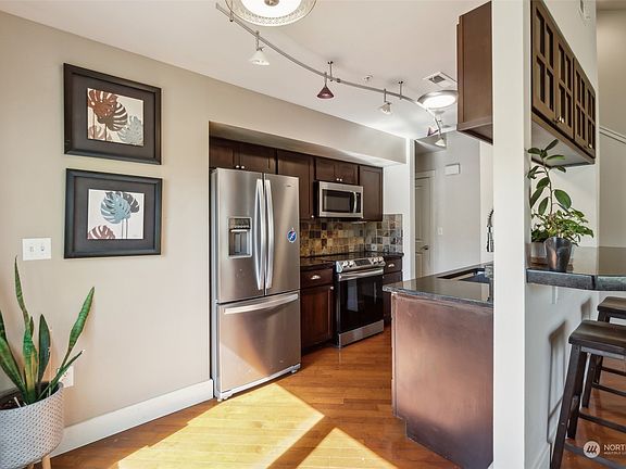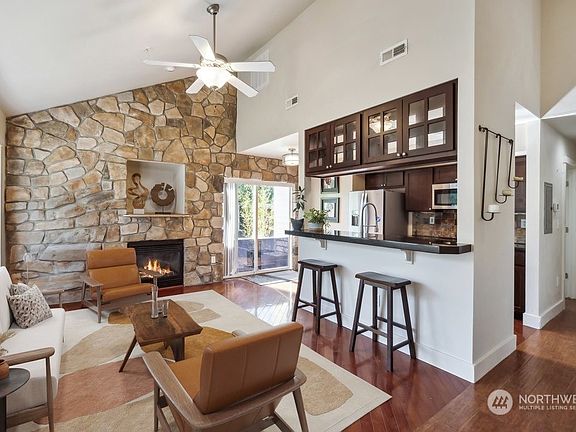 Discover contemporary living in this captivating 2-story 2 bedroom, 2 bathroom townhome. The inviting open-concept main space boasts a striking rock fireplace, eat-in kitchen with bar seating and seamless flow to the patio, perfect for gatherings. Downstairs features a spacious bedroom and full bath, while upstairs offers another bedroom, full bath, and ample closet space. With one assigned parking space and plenty of guest parking, convenience is assured. Minutes from Boeing and all the amenities you need, enjoy easy access to work and play. Don't miss the community playground. Experience modern sophistication and effortless living in this thoughtfully designed home.