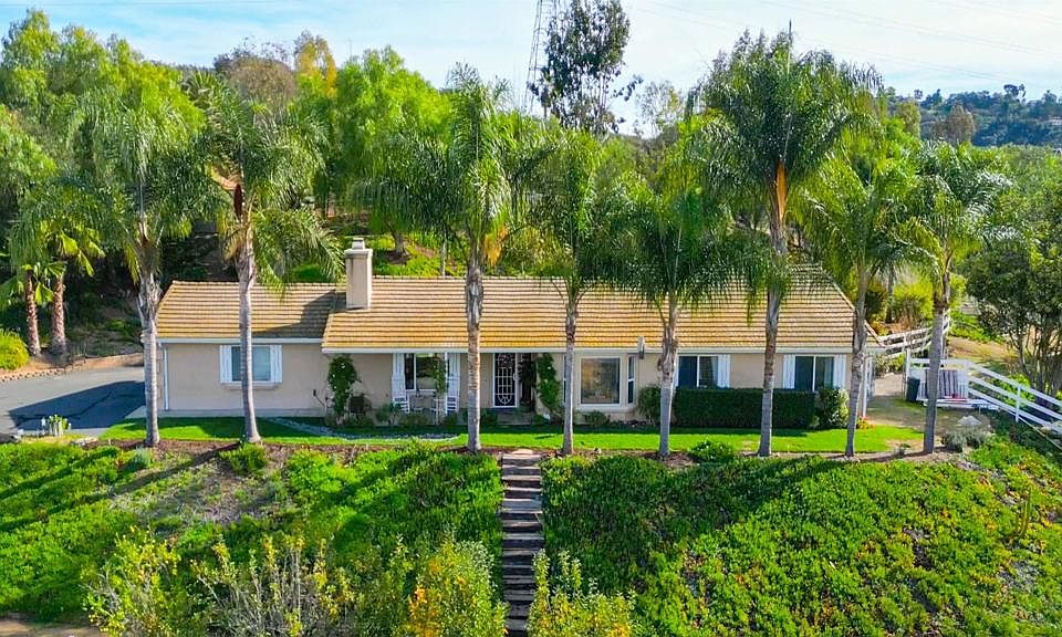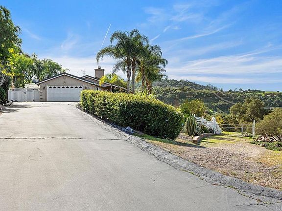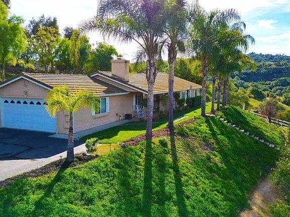 Welcome to Heritage Park Estates - an enclave of 13 custom built homes in Valley Center just minutes from the 15 freeway. This single story home sits on 2 acres and is located at the end of a cul-de-sac with beautiful mountain views. The home offers just over 1900 sq ft of comfortable living space and features 3 bedrooms plus a den, 2 full bathrooms, a living room, kitchen, and separate dining room. The living room offers vaulted ceilings and a cozy, stacked-stone fireplace. The spacious den makes the perfect office, library, craft room, or could be converted into a 4th bedroom. The primary bedroom features an oversized ensuite bathroom with double door entry, walk-in shower, soaking tub, a vanity with dual sinks, and a walk-in closet. The 3 tiered lot offers flexibility and creativity for usage. The main yard surrounding the house feels private and serene with a large covered back patio, multiple raised garden beds framed for year-round use, approx 26 fruit trees including tangerine, Valencia orange, navel orange, apple, lemon, plum, peach, apricot, lime, tangelo, and mulberry. There is also a 5 barrel rain collection system to help save on water bills. There are steps up to the top tier which currently has an above ground pool but is also a perfect spot for an ADU. The lower level is fully fenced and has a gravel driveway for parking an RV or additional vehicles. The lower section also contains an open space easement. The home has 24 solar panels with a low monthly payment of $159/mo with only 10 years left on a 20 year lease. There are also 2 sheds on the property ideal for extra storage. All this and no HOA! If peace and quiet and beautiful views are what you are looking, while still being close to everything, 11106 Calgary Way is the perfect address to call home!