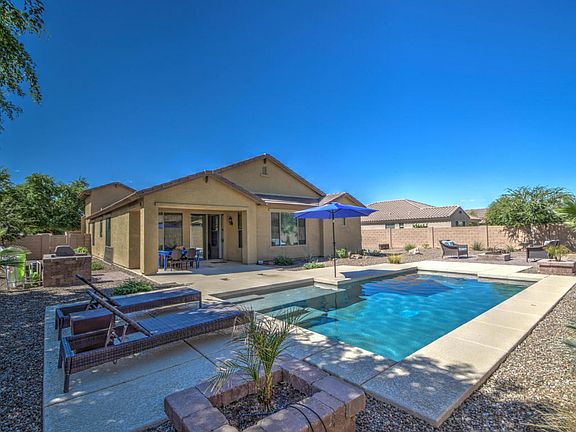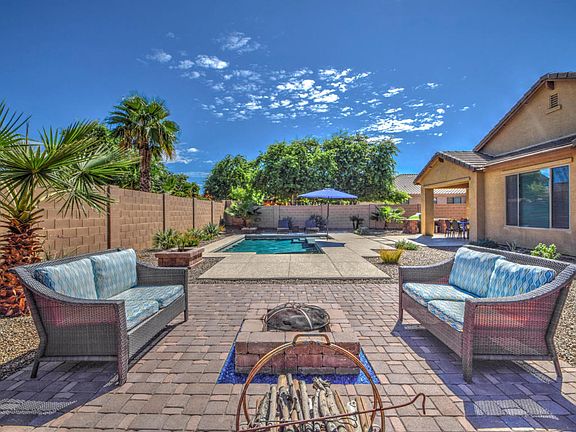 Updated 4 bedroom, 3 full bath, single level home on an oversized 12,150 sf lot! The tile,int. paint,garbage disposal & the D/W was upgraded 5 yrs ago. Enjoy this huge back yard featuring a sparkling pool,fire pit, cov. & extended patio plus a paver patio & RV gate. The front room can be used as extra dining, living room or den. There's a front bedroom & bath-perfect for guests! Fabulous open kitchen includes granite counters, tall cabinets, big island & gas stove. Family room has a TV niche & surround sound. The 2nd hall has 2 more bedrooms, hall bath, large laundry room (extra storage & drying rack)& elegant master suite. The master bath boasts a large closet w/linen space, tall vanity, separate garden tub & shower.Blinds & modern c/fans and many more extras!