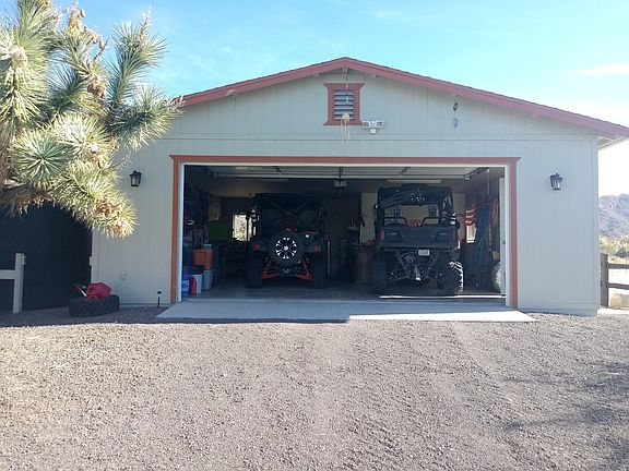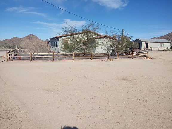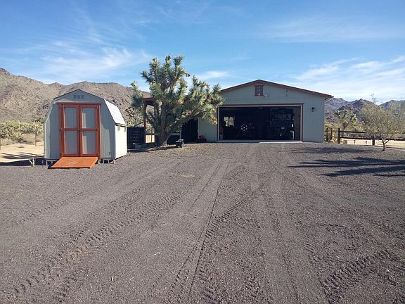 Super clean, well-maintained, cozy 3-bedroom house on 2.35 acres with mountain and panoramic views. Fully fenced with a security gate at front of driveway. House has an enclosed insulated front porch area with a 4 x 8 span f windows to take in the dramatic views of surrounding mountains and desert. It's a great space for entertaining or relaxing in the hot tub (yes, it stays)! The interior of the house features an open floor plan with tile throughout living area and laminate in the bedrooms. Outdoor seating areas provide ever-changing views of sunrises, sunsets and night skies. An outdoor sidewalk and/ or gravel driveway lead the way to the detached 2-car garage that has the 3/4 bath for easy cleanup, workbench and plenty of storage space. A large shed on the property provides more storage space. The home is on electric and has two 2500-gal above ground water storage tanks to store your delivered or hauled water. There is a lean-to for burros or horses on the property. Priced to sell! Perfect for those looking for a weekend getaway or a full-time residence with privacy, peace and quiet in the surrounding beauty of mountains, desert and wildlife.