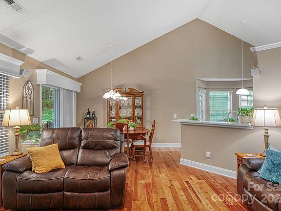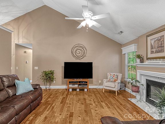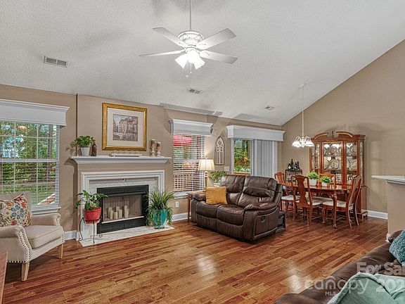 This charming ranch greets you with a welcoming rocking chair front porch and flows into a vaulted living room with a cozy fireplace. The upgraded kitchen features white cabinetry, quartz countertops, stainless steel appliances, and a breakfast bar overlooking the dining area and living room—perfect for entertaining. The primary suite boasts vaulted ceilings, a spa-like ensuite with walk-in shower, garden tub, and dual vanities. Secondary bedrooms feature chair rail detail and share a full bath with a tub/shower combo. Enjoy the outdoors on the back deck and patio overlooking a private, fenced backyard. Additional highlights include gutter guards, architectural shingles, 1-car garage with built-in storage, and a double driveway with extra parking. Conveniently located with easy access to 485, Mint Hill, and Harrisburg! 2 pools, tennis courts, clubhouse, playground, and miles of walking trails.
