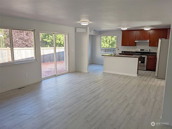 Welcome to this secluded South Everett rambler tucked in at the end of a quiet cul-de-sac, embraced by verdant greenbelts. Tastefully restored with new flooring and lighting throughout, solid-core doors, all new kitchen appliances and beautiful granite countertops. Open concept space with generous living room, kitchen with island and bright cheerful dining area. Sliding door leads out onto the large private deck perfect for outdoor entertaining. Primary suite includes private full bath and walk-in closet, two additional bedrooms are splashed with southern light from large windows. Fenced yard overlooks forested public land on one side, providing privacy and serenity year round. Don't miss your chance at this tranquil oasis!