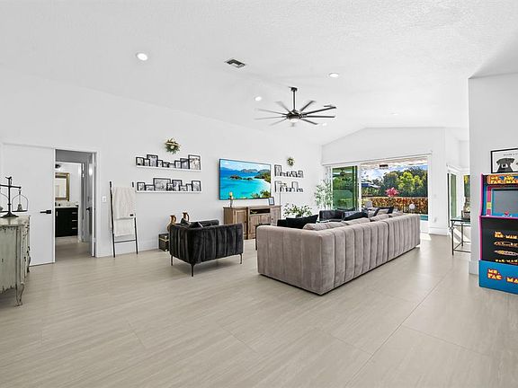 Welcome to this move-in ready, exceptionally maintained and updated 3 bedroom, 2 bath, pool, lake and golf course view home in prestigious Boca Woods Country Club. Features split floor plan, completely remodeled bathrooms, new 24x48 porcelain tile throughout, soaring ceilings, custom closets, all impact windows and oversized pocket sliders providing tons of natural light and great views. Expansive primary bedroom has vaulted ceilings, dual closets, and sliders to travertine paved lanai, perfect for your morning coffee. Large, covered patio with pool and hot tub makes entertaining and every day Florida living a breeze. Primary bath has soaking tub, double vanities and separate shower. Third bedroom with double French doors make a versatile media room or home office. SS appliances, eat in kitchen, interior laundry room with lots of storage and much more. Nestled on a quiet street, on a private lot with amazing lake and golf course views and no rear neighbors. Relax and enjoy spectacular sunsets and ever-changing display of wildlife from your own covered patio and fenced backyard with edible garden. Boca Woods offers many resort style amenities including two 18 hole championship golf courses, pickleball, tennis courts, state of the art gym, spa, game room, restaurants with casual and fine dining, in a newly, fully renovated clubhouse with valet, top notch service, activities and events for all members and their guests. Mandatory membership required. Furnishings negotiable.