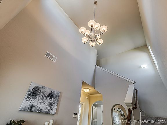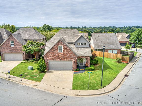 Fantastic new listing in Jenks school district. Roof one year old. Corner lot with room to expand back yard. Bring the kids! The school bus stops here. Professionally landscaped with sprinkler system. New paint interior and exterior. Primary double window to be replaced prior to closing. Upstairs fourth bedroom could also be game room. Electric stove, but also stubbed for gas. Check out the view of the Tulsa downtown skyline from the upstairs right corner bedroom! Storm shelter in garage stays. French drains in backyard to ensure proper drainage. If you need plenty of space for the larger family or need to office from home, this workable floor plan can accommodate for both!