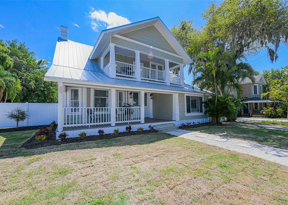 Welcome to the embodiment of the Historic Palmetto District. “Historical Elegance” is the perfect term to describe this one-of-a-kind home. This spacious three-bedroom, four bath home measures in at just under 3,000 feet of living space. Looking upon this beautiful piece of architecture from the outside, you will immediately envision yourself rocking on the large front porch with a tall glass of lemonade while reading the newspaper, in the warm Florida sun. Once through the unique coral front doors, you’ll note the staircase straight ahead with the great room to the left and the dining room to your right. The great room includes a beautiful working fireplace on an angle, making itself the star of the room, which is also encompassed by windows all around, making the space light and airy. The dining room fits a grand table, fit for a large family or for guests to feast in yet another large space, surrounded by the sun or moonlight. Off of the dining area, you will find a library or study room, complete with built in shelves and a desk area, all tastefully and freshly painted. The kitchen in this home is perfect for the chef of the family! A large butcher block countertop island exists for chopping and preparation space and doubles as a seating area for dining. There is plenty more butcher-block counter space available around the perimeter of this gorgeous kitchen for even the largest of meal preparations. Hosting the holidays in the kitchen and grand dining room will be absolutely breathtaking! Travel further through the home and you’ll find the master bedroom complete with the home’s second fireplace! This romantic space allows for a master bathroom with a gorgeous, vaulted ceiling, following along the A-frame build of this historical home, including elegant shiplap along the ceiling. All three bedrooms have their own ensuite bathroom, with a half bath upstairs as well. This diamond-of-a-home proudly displays not one, but two balconies to enjoy your morning cup of coffee or your evening cocktail, while watching the sun rise or set. The back yard is completely fenced and large enough to have your own pool, which would make this the ultimate dream home! This home is a perfect storybook residence for the sweetest couple or even the largest of families. Holidays in this home are going to be spectacular for whoever is lucky enough to own it. Historic Palmetto is located near Snead Island, Anna Maria Island, and Emerson Point Nature Reserve. Downtown Palmetto is biking distance from this home, where you’ll be able to shop at the cutest shops there is! Just over the bridge, you can eve bike to downtown Bradenton to enjoy the historic scenery on that side of the Manatee River! The very best store and restaurants are all just blocks from this amazing property. Schedule your showing now because this beauty will not last long!