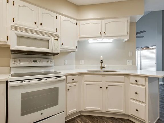 Modern Kitchen: Freshly painted cabinets, new quartz countertops, and white appliances (microwave, dishwasher). The refrigerator has recently been updated.