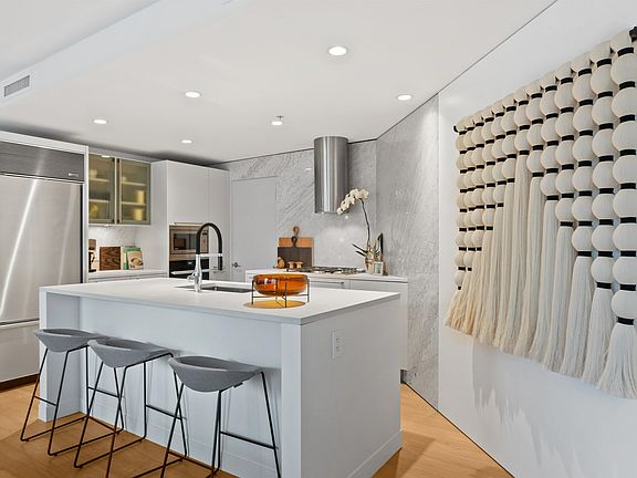 Stunningly renovated with a unique 200SF deck! This exquisite condo had been completely renovated & designed by Falken Reynolds Interiors. Designer kitchen offers high end appliances, caesarstone counters & gas stove. Cozy up by the marble fireplace & enjoy the spacious & open living/dining concept w/ designer lighting. Custom millwork in 2nd bed provides office setup & murphy bed. Primary has WIC, craftsman cabinetry & elegant ensuite w/ nuheat tiled floors. The large sunny patio is SW facing, perfect for entertaining and bright exposure keeps this condo full of natural light! A/C keeps the home at optimal temperature all year round. Shangri-La offers a fitness centre, concierge, spa & outdoor pool. Live/Work zoning! Upscale Alberni St offers the best restaurants + shopping in the city!