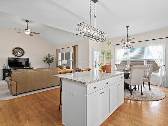 Sprawling ranch home with quality upgrades and amenities featuring a sun-filled vaulted living room, a stunning kitchen with staggered custom white cabinets with crown molding, new subway tile, large island, stainless steel appliances, and granite counters. Dining area with a door leading to a 15x12 covered back patio plus a paver patio overlooking a large fenced yard. The master suite offers a tray ceiling, walk-in closet, and private bath with a double white vanity, water closet, and oversized shower with seat. Bedrooms two and three feature vaulted ceilings, and bath number two includes a double white vanity. Convenient main-level laundry room with sink, an insulated and drywalled three-car attached garage with an epoxy floor, and an open-concept solid oak staircase leading to a full basement with roughed-in plumbing. This home looks and feels like brand new. High efficiency furnace, humidifier, low-E windows, and insulated garage doors all increase the efficiency of the home. Maintenance free vinyl accented with shaker look and the covered front porch add to the inviting elevation.