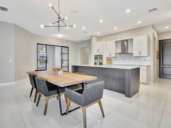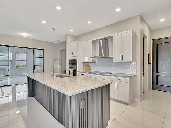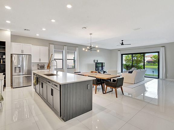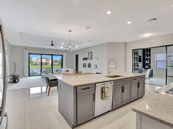 Absolutely Beautiful! Fall head over heels for this 2019 Heron model home that's set to astound you. Boasting exceptional finishes, this property is a true showstopper, perfectly aligned with contemporary trends. From the magazine-worthy decor to the tranquil lakefront location and ample yard space, this home has it all. Rest easy knowing that this newer construction comes with impact glass for added security. As you step inside, prepare to be enchanted by the stunning 36-inch white porcelain floors that grace every inch of this home, accentuated by soaring ceilings. The glass sliding doors leading to the den serve as a focal point, seamlessly integrating with the open great room layout.The gourmet kitchen is a work of art... featuring white shaker cabinets, a generously sized island with contrasting dark grey cabinets, and sleek quartz countertops. Top-of-the-line stainless steel appliances, including a contemporary hood and stylish tile backsplash, round off the modern aesthetic. The primary suite is a sight to behold, with striking dark blue walls and serene lake views. The primary bath exudes freshness, offering a soaking roman tub, a spacious shower with subway tile up to the ceiling, and a seamless enclosure. The generous walk-in closet is thoughtfully designed to maximize storage. The den is a masterpiece, perfect for remote work. A dramatic floor-to-ceiling built-in unit with unique glass sliding doors steals the spotlight. Bedroom 2 is tastefully furnished with a custom white bunk bed, a floating desk, and a well-appointed closet. It shares a jack and jill bath with bedroom 3. The powder room is a work of art, with creative tile reaching the ceiling, white shaker cabinets, and quartz countertops, all harmonizing with the dark blue walls. The laundry room offers ample storage with shaker cabinets and a laundry sink. This home is truly a gem, combining style and functionality in a perfect lakeside setting.