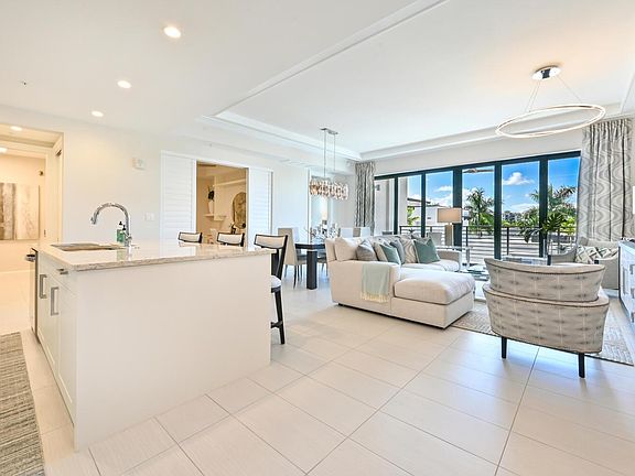 This former Model home with 2 bedrooms + den and 2 baths, creates an inviting contemporary space with the natural light you would expect in a Naples coastal retreat. The luxurious primary suite offers a king-size bed and large walk-in shower. The guest bedroom has a queen-size bed for guests with ensuite bath. The den features a full-size sleeper sofa and a custom built-in desk. Entertaining is effortless with the oversized kitchen island and ample seating for family and friends. The living room offers a comfortable couch, 2 side chairs, and a new 65" Class Bravia OLED Smart TV and SONOS. Floor to ceiling glass doors lead out to the lanai with 2 chaise lounges and a table for outside dining. Eleven Eleven Central amenities include an infinity pool, fitness center, social room, game room, movie theater, grilling area, fire pits, cabana bar with TVs, electric car charging stations, putting green, life-size chess board, Bocce, and many planned social events throughout the season. The private shuttle will take you to the Gulf beaches or to 5th Avenue and 3rd Street or the world-class shopping and dining are only about 5 block away! Live exceptionally in Eleven Eleven Central!
