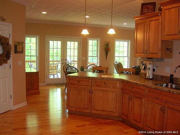 A custom finished 5 bedroom 3 bath ranch nestled in a cul-de-sac in Sellersburg School district. Spacious room sizes within the 3,490 finished square feet. The kitchen has pantry, breakfast bar, double ovens, cook-top, solid wood custom cabinets with a ginger wash, and eat-in area opening to the huge 16x16 sq.ft. covered deck. Crown molding through-out and hickory hardwood floors. The walk-out basement has a utility garage and an open family room with full bath and two bedrooms with egress. All appliances stay and it is plumbed for central vac and a wet bar in the family room. This home is beautiful to live in and shows great.\n\nInformation Deemed Reliable But Not Guaranteed. Information provided by the Southern Indiana REALTORS® Association, Inc. © 2010 SIRA Multiple Listing Service. All rights reserved. Brokered And Advertised By: RE/MAX FIRST Listing Agent: Karen G. Shireman