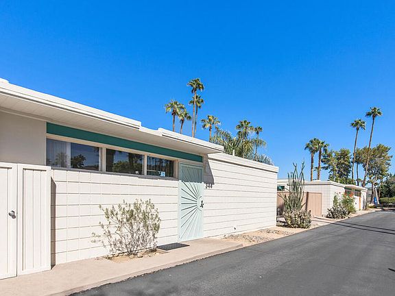 Welcome to this Palm Springs ''Gem'' - a one-bedroom bungalow condo at the iconic Ocotillo Lodge; a unique mid-century modern community designed by architects William Krisel and Dan Palmer. This charming, bungalow condo is nestled in the historic and picturesque Twin Palms neighborhood with parking right outside your door. The open floorplan with 9 foot ceilings and concrete walls is welcoming, relaxing and private. Plenty of room to enjoy and entertain friends and family on the spacious, South-facing patio with views of the San Jacinto mountains, towering palms, and plenty of sunshine. Updates to this home in 2018 include tile flooring, bathroom skylight, shower and plumbing enhancements, as well as kitchen updates. The HOA includes ALL the utilities: electric, water, sewer, trash, cable, internet, and exterior insurance. Pay one bill each month! Enjoy the community amenities: a gorgeous pool, two spas, sunshine bar, billiards room, and fitness facility to name a few. Restaurants and shopping are conveniently located close by. There are currently no HOA restrictions on vacation rentals. Plans are underway to recognize the historical significance of this distinctive community built by the Alexander Company. Don't miss your chance to own a piece of Palm Springs history - location plus the large outdoor living space make this bungalow condo one of a kind! Schedule your private tour today.
