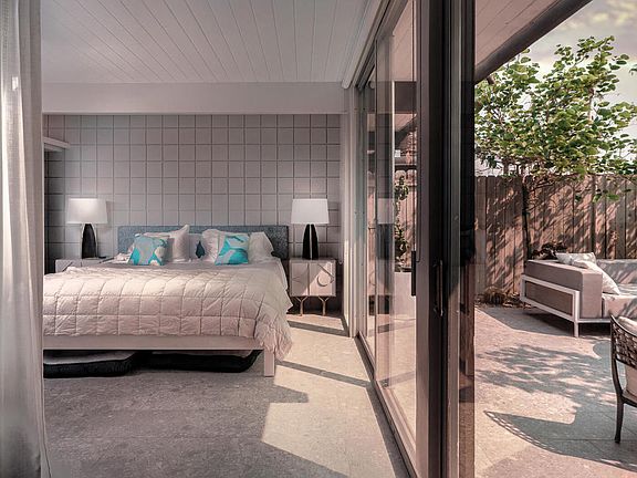 Tastefully and highly upgraded walk up unit in a quiet SW corner of Ocotillo Lodge. Large 330 est. SF patio with views to the mountains and an easy access rear gate for pool access. This unit also has a laundry closet with stacked Bosch washer and dryer and extra room for storage. It was architect William Krisel's first work completed here in the desert and since 1957 this magical place has been welcoming visitors and residents alike. Known as the Dinah Shore Suite, this larger floor plan rarely comes on the market. At Ocotillo Lodge, Krisel created an exercise in contrast with thick architectural block walls balanced on the opposite side by light panes of glass which connected the indoor space with the outdoor space making both a cohesive whole. No wonder these homes feel so much larger. In the bathroom, the architect thoughtfully provided skylights above the sinks so that every part of the home is a bathed in natural light. this is one of the nicest and most authentic units at Ocotillo Lodge. HOA fee includes water, electric, gas and cable. Parking is any open space and there is always ample parking in this SW corner of the HOA. This unit was gutted in 2018, new floors inside and outside, new electrical and plumbing, walls, etc, lighting, etc, new bathroom.
