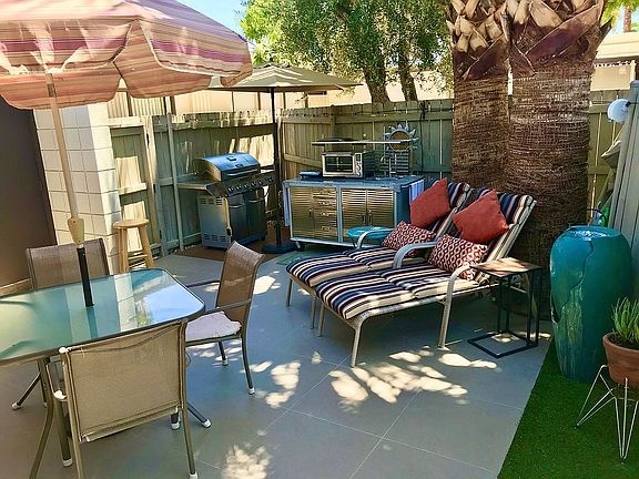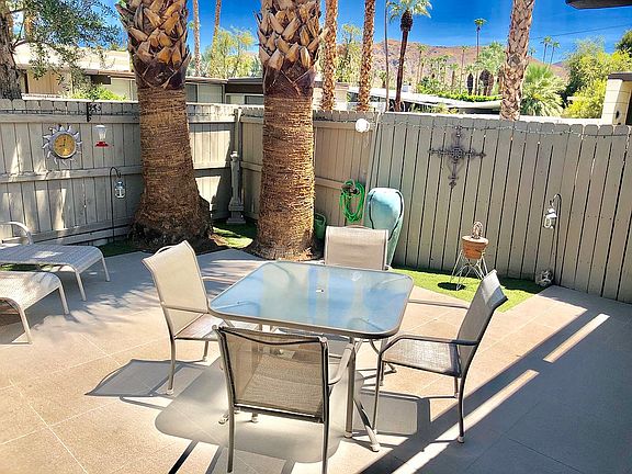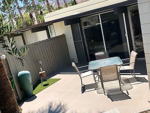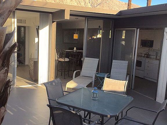 Iconic Ocotillo Lodge Mid Century Modern. Living at it's Best ! This rarely available Twin Palms Dr South Side of Complex. Modernism/ Krisel/Palmer … BUNGALOW FEATURING : Porcelain tile throughout , beautiful updated kitchen with quartz countertop, undermount stainless sink, new BOSCH dishwasher, new drawer cabinets, fireplace, sliding walls of glass, view from all, huge patio, fully tiled bath with huge skylight, south and east exposure, 2 palm trees, outdoor kitchen, Haiku ceiling fan, original 1957 block walls, ceiling , outdoor storage, A/C system 2018, Nest smart home,Furnished…New LG XL Washer/Dryer Combo No rental restrictions monthly maintenance $513, includes electric, water, internet/cable. Private entrance, fee simple. Resort style pool, 2 hot tubs, sunshine bar, club house, workout room, outstanding rental history, proof of funds necessary prior to. Buyer agent protected @3% commission