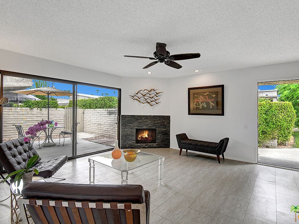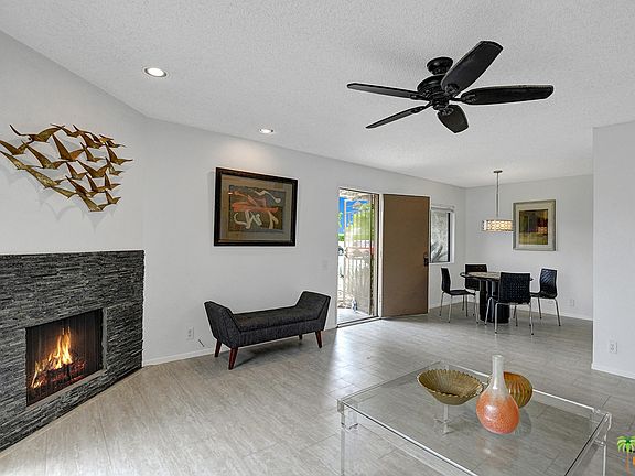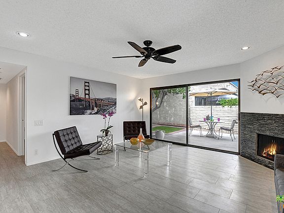 This Ramona Villa is located in a quiet section of the development. New beautiful high grade laminate flooring has just been installed throughout the entire unit. You will also find a recently updated kitchen with stainless steel appliances and a new refrigerator. This is the only unit in Ramona Villas with a fireplace. There is a closet that can be plumbed for a washer and dryer in the hall. This unit also features a completely walled back yard with a patio and mature grapefruit tree. A good sized storage closet is attached to the unit as well as an additional large storage locker in the carport. This is an excellent South Palm Springs location with earthquake insurance, remote gates, community salt water pool and spa, tennis court and clubhouse complete with billiards and gym! Perfect for a primary or a second home! Come enjoy the Palm Springs Lifestyle! YOU OWN THE LAND!