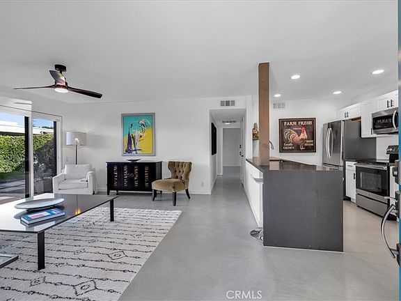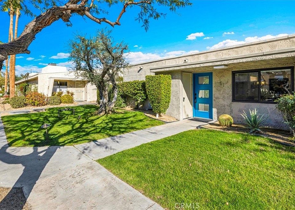 Welcome to Ramona Villas, a gated community designed by renowned architect Richard Harrison. Situated on Fee Land, this single-level, end unit offers effortless living with no steps, only one shared wall, no neighbors above or below. Its desirable location brings in all the desert light and enhanced by skylights. This tastefully updated home features new concrete flooring, new dual-pane windows and sliders, an open-concept living area, and upgraded kitchen and baths. The spacious primary suite includes two closets, a remodeled ensuite bath, and direct access to a private patio. A second bedroom is conveniently located across from hall bath. The full-size stacked washer and dryer are also included. The private north- and west-facing backyard offers two covered patios, a lawn area for pets, and mountain views. Ideally positioned across from the clubhouse, saltwater pool and spa, fitness room, and sauna. The home also sits just steps from EV charging stations and tennis courts. The end-space covered carport includes built-in storage cabinets, with an additional storage closet outside the unit. The low HOA covers the roof, earthquake insurance, water, trash, and rear-yard maintenance. Within a secure gated setting and just minutes from downtown Palm Springs dining, shopping, and entertainment, this exceptional home delivers comfort, style, and an enviable desert lifestyle.