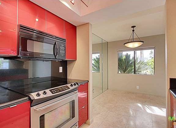 Designed by Albert Frey, Ramona Villas is a pet friendly gated community within walking distance to downtown Palm Springs. This condo offers the best panoramic South/West Mountain views of any unit and is located in the heart of the complex across from the Clubhouse/Fitness Center, the community salt water pool/spa and the tennis courts. This two bedroom, two bath unit has been beautifully renovated with Travertine floors. Both remodeled bathrooms and kitchen feature designer finishes of black granite countertops with red lacquer cabinets. Washer/Dryer included and are located in the unit. The semi-private, oversized patio offers spectacular mountain views.