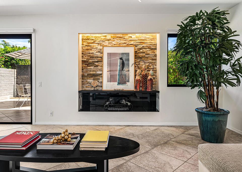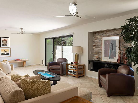 Spanning 1,313 sq. ft. on a single level, this rare Ramona Villas residence offers the convenience of condo living with the ambiance of a private home. A highlight of the property is the expansive 900 sq. ft. private patio, lined with lush plants and shrubs maintained by HOA gardeners--an outdoor retreat for entertaining or quiet relaxation.Inside, the remodeled kitchen shines with black stainless steel appliances and quartz countertops. Throughout the home, you'll find dual-pane windows, custom Hunter Douglas blinds, recessed lighting, matching ceiling fans, and neutral tile flooring that flows seamlessly to the outdoors. The spacious primary suite features an 8-foot dual vanity, walk-in shower, and generous closets, while both bathrooms offer quartz counters and skylights. Additional conveniences include an interior laundry room with a sink and shelving, a newer HVAC system and water heater, ample storage space, and a designated covered carport with a storage cabinet.The HOA provides roof maintenance, water, trash, and landscaping services, making this a true turn-key, lock-and-leave property. Enter directly into your home without passing any neighbors' doors--quiet, private, and secure. It's the perfect blend of single-family privacy with the convenience of condo amenities.Designed by architect Richard Harrison, the gated and pet-friendly Ramona Villas community features a saltwater pool, heated spa, clubhouse with a fitness center and library, EV chargers, and tennis courts, all set amidst beautifully landscaped grounds on FEE land. Enjoy walkable and bikeable access to the newly expanded CV Link, and take advantage of the short distance to downtown shops, dining, and entertainment.