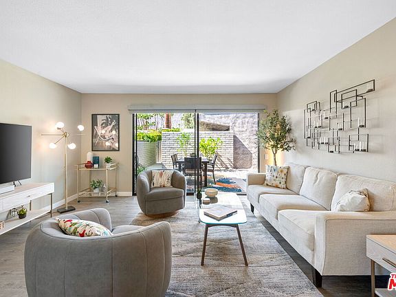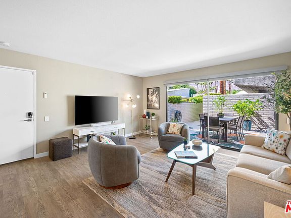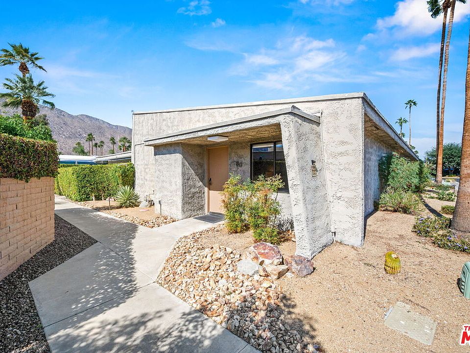 Welcome to Ramona Villas, designed by famed architect Richard Harrison and considered one of the finest complexes in the community. This tastefully remodeled end unit offers a harmonious blend of classic Mid-Century charm and Modern chic. Situated on fee simple land, this thoughtfully designed 2-bedroom, 2-bathroom condo spans 1,069 sq. ft. and showcases sweeping mountain views from its private, west-facing backyard. A perfect retreat for Palm Springs living. Inside, the unit features a stylish interior with granite countertops, sleek stainless steel appliances, in-unit laundry, and a newly installed A/C. The private patio provides a serene setting for enjoying the desert sunsets, while the community amenities elevate your lifestyle with a sparkling saltwater pool, spa, fitness center, clubhouse, tennis court, and EV charging stations. The HOA fee covers essential services, including roof maintenance, earthquake insurance, water, and waste. With its secure gated setting, this home offers both privacy and convenience, being minutes away from the vibrant downtown of Palm Springs with its array of dining, shopping, and entertainment options. This exceptional unit is a complete package, offering comfort, style, and an enviable lifestyle. Schedule your showing today and open the front gate to your serene courtyard oasis!