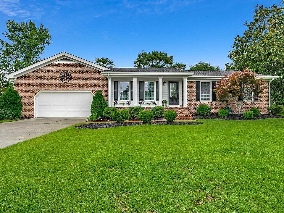 Four-bedroom, three-bathroom, meticulously kept home in the sought after Tilghman Estates neighborhood of North Myrtle Beach with no HOA. This spacious, one level home has so much to offer including a large front and back yard with room for a pool (almost a half-acre), mature trees, lots of parking with extra concrete, front porch, large rear deck, nice grass, irrigation system that uses well, commercial grade gutters, encapsulated crawlspace, large (over 500 sq ft) two car garage, stationary stairs going to attic space, new garage door and opener (can control from phone), large shed (12x16) with lawn mower and golf cart parking (11x11), new roof in 2019, new Hardee siding, open floor plan, great room concept, flat ceilings, split floor plan, separate den/office area with built-ins, crown molding throughout, recessed lighting, propane (remote operated) marble fireplace, lots of natural light, plantation shutters, two master suites, large secondary bedrooms, pocket doors, formal dining room, huge master suite (added in 1999) with access to back deck, extra-large walk in closet, double sinks, jetted tub, large tiled walk-in showers (in both masters), upgraded stainless steel appliances, granite countertops, tile backsplash, nice cabinets, and new water heater. All this and just a short golf cart ride to the beach in a perfect location!