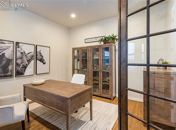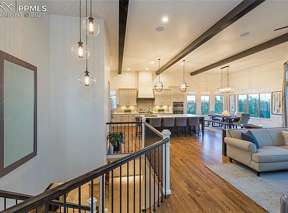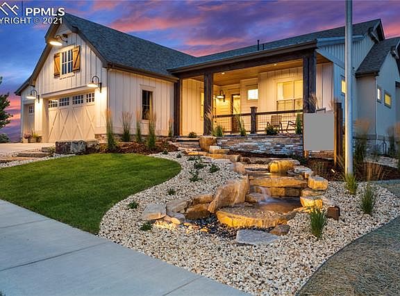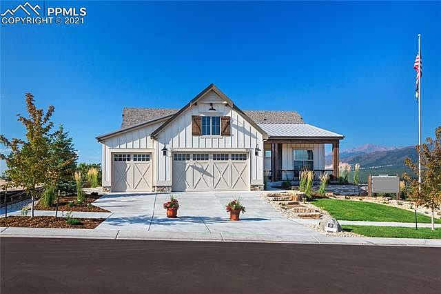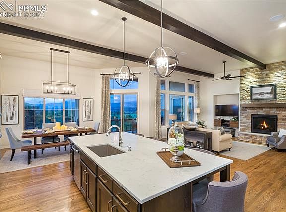 Welcome to The Sterling, Goetzmann Custom Homes innovation of the ranch-plan where youll want to kick off your boots and stay awhile. This home has an attitude of gracious living. Setting foot onto the front porch you feel the beginning of The Sterlings masterpiece design. Entering the home, you are greeted by the soaring beamed ceilings and spacious rooms featuring abundant natural light and spectacular views. Warm alder doors and hardwood floors on the main living area add to the warmth of the great rooms floor to ceiling stone fireplace. The ideal dream kitchen includes stainless steel appliances to delight any chef. In addition to the kitchens enormous island, solid surface countertops and painted perimeter cabinets are only steps away from the walk-in pantry. Find the perfect retreat in The Sterlings master bedroom. The elegant 5-piece master bath includes a freestanding tub, quartz countertops and a stunning unobstructed view of the U.S. Air Force Academy. Not to be forgotten, the main level includes a private junior suite and study with french doors. The downstairs doesnt skimp on functionality or ambience; its relaxed recreation room offers a second gathering spot for entertaining with its private lounge area and wet bar, stone fireplace and patio. The Sterling welcomes you to a home of fine craftsmanship and design and invites you to explore its unbelievable adaptability and luxurious comfort.