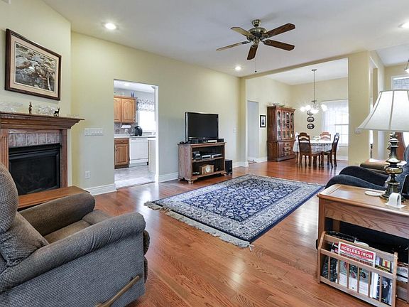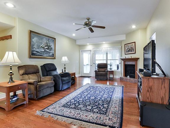 Good Life at StoneBridge Village in this custom home with a very private back yard, sun room and deck that backs to trees and common area. The home features beautiful hardwood flooring, Dakota cabinetry, nice breakfast nook with natural light. Formal dining room open to living area with corner remote start gas fire place. Lower level w/extra office & spacious recreational room, Plus bonus room could be a kitchen- plumbing already there, with a separate entrance & Workshop. Extra wide & deep garage. Water fountain in front auto fills from sprinkler system. Level lot and so easy to care for! New shingles in 2017. Owners love the resort lifestyle included at no costs: clubhouse, fitness ctr, tennis and basketball courts, 3 pools and LedgeStone Golf Course access & activities at reduced fee.