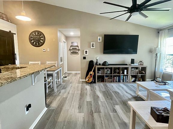 The bathrooms have been upgraded with new countertops and all cabinets have been repainted and adorned with new hardware. The attention to detail continues with the newly installed industrial ceiling fan and recessed lighting. The doors and door frames have been meticulously repainted, revitalizing their appearance and adding a polished finish to the entire unit. The kitchen features a new sink and stylish barn doors for the pantry.