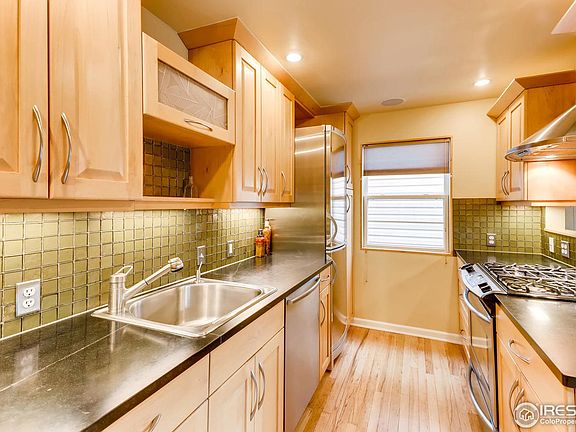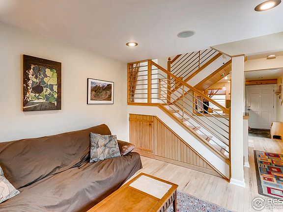 LOCATION! Designer unit featured in Natural Home Magazine. South facing redwood deck looks onto Historic Mapleton Hill. Mt. Views. Lots of morning sun. Flagstone entry. Kitchen:Green cabinets, ConServ Refrigerator, Bosch dishwasher, Gas Stove. Oak hardwood flooring on main level, insulated blinds, Pella Slider, built in speakers. Upstairs: Ceiling fan, oak hardwood & cork floor, built in speaker. Bath: Custom vanity, cast iron tub, flagstone floor,Toto toilet. Walk to Pearl St, trails, transit!