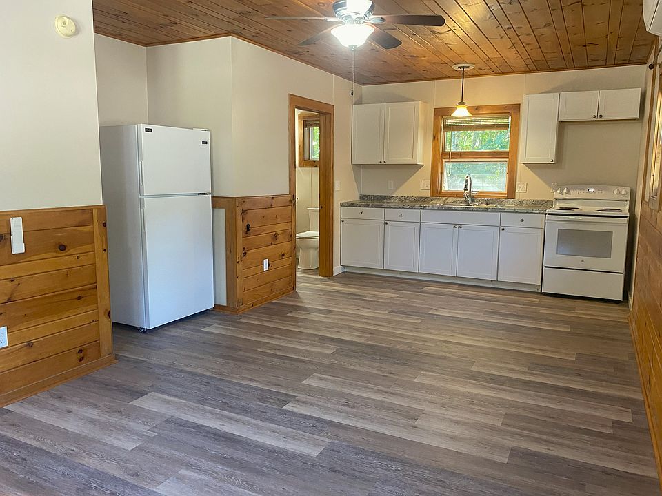 This great two-bedroom apartment is available for a September move-in! Recently updated, this unit has the best of both worlds - an updated kitchen and bathroom, with warm knotty pine walls and ceilings throughout, giving this unit a relaxed "cabin" feel. Enjoy a shaded front porch overlooking a quite yard and woods. Even better? The rent includes ALL utilities, even air conditioning and WiFi. The larger bedroom in the back (accessed through the bathroom) has a door to the outside. Plenty of storage with a large coat closet in the entry and large closets in each bedroom. The unit includes 2 off-street parking spots and shared outdoor space. This unit can welcome one cat or dog (max of one animal with $25/month fee.) There are no laundry facilities at the property, but there are three laundromats within a couple minutes drive. The property located at 1111 Roosevelt Trail in Windham has been converted to long-term residential apartments. This unit is within a 2-unit "cottage" at the back of the property, behind the larger apartment building, making it quiet and private. Enjoy the wonderful community, just a short drive to Tassel Top Park on Sebago Lake and all North Windham has to offer. Please reach out to Highgate Management to schedule a showing or for more information! 12 month lease required. Security deposit equal to one months rent required. All interested parties must go through our application process and be approved before being offered a lease.